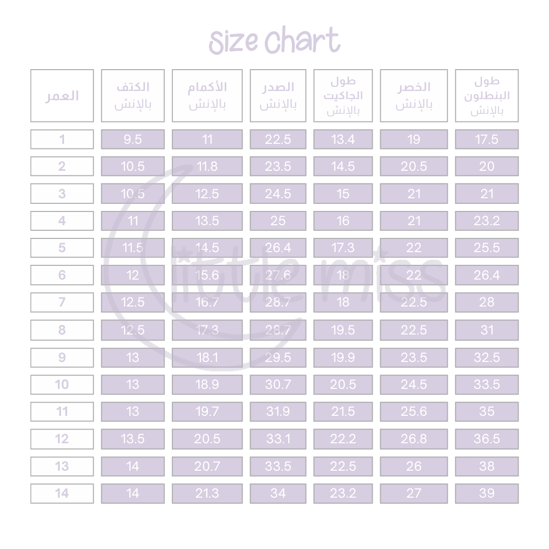 | Size | 0-3 months, 3-6 months, 6-9 months, 9-12 months, 12-18 months, 2yr, 3yr, 4yr, 5yr, 6yr, 7yr, 8yr, 9yr, 10yr, 11yr, 12yr, 13yr, 14yr |
